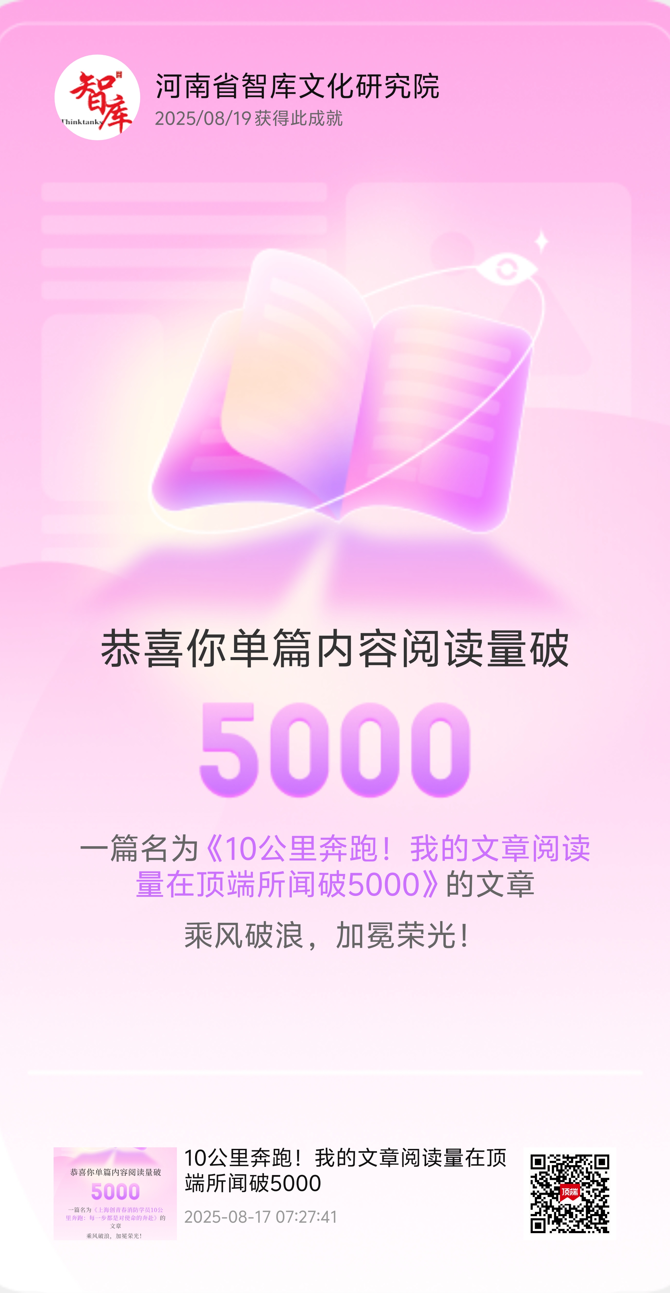 2025年8月19日,河南省智库文化研究院迎来高光时刻!一篇发布于8月17日7时27分41秒,名为《10公里奔跑!我的文章阅读量在顶端所闻破5000》的文章,单篇阅读量强势突破5000 。“乘风破浪,加冕荣光”,这背后藏着怎样的故事?跟着我们一探究竟!