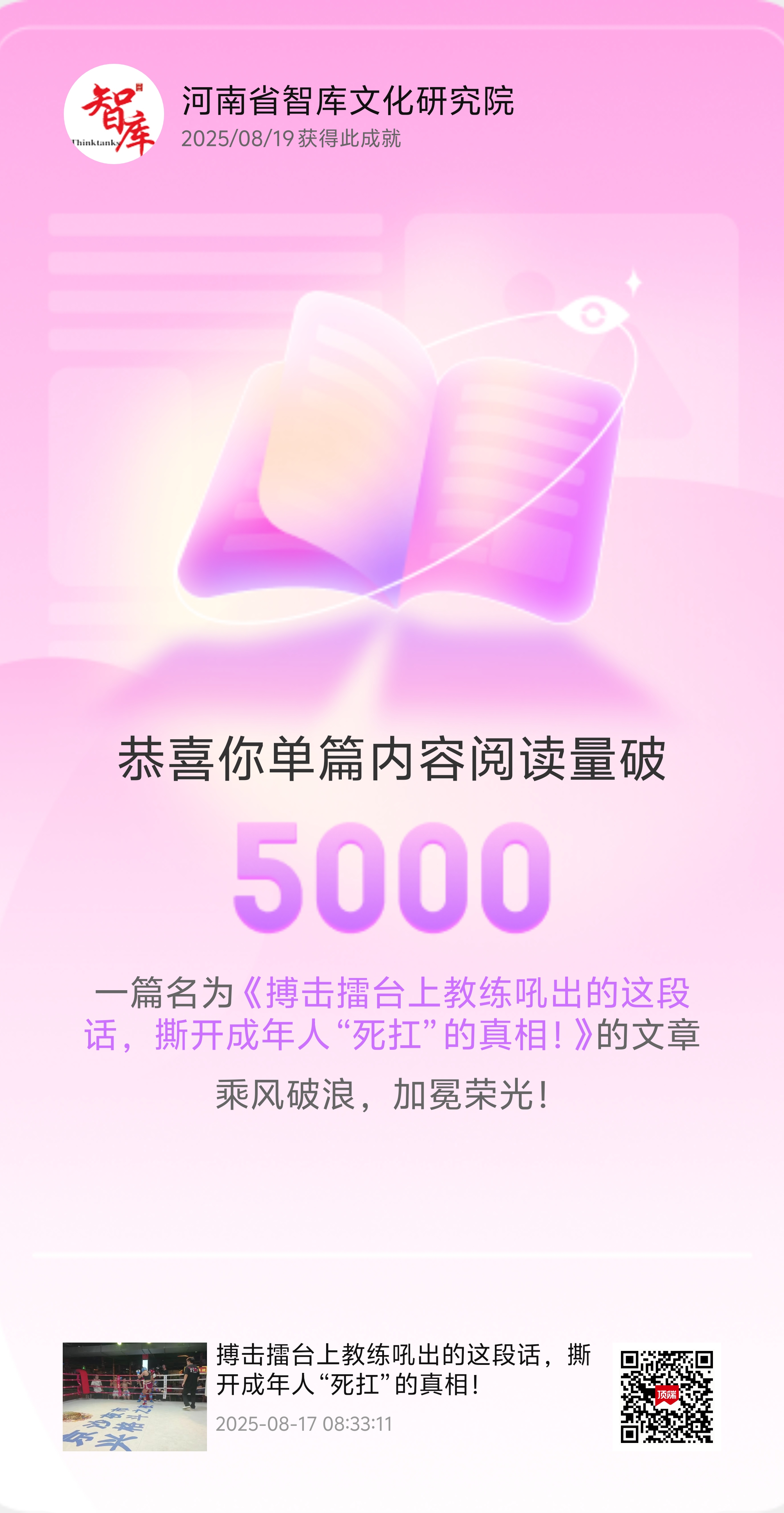2025年8月19日,河南省智库文化研究院迎来亮眼时刻!一篇发布于8月17日08:33:11,名为《搏击擂台上教练吼出的这段话,撕开成年人“死扛”的真相!》的文章,单篇阅读量强势突破5000 。“乘风破浪,加冕荣光”,搏击擂台上的话语,怎就戳中无数成年人的心?快来一探究竟!